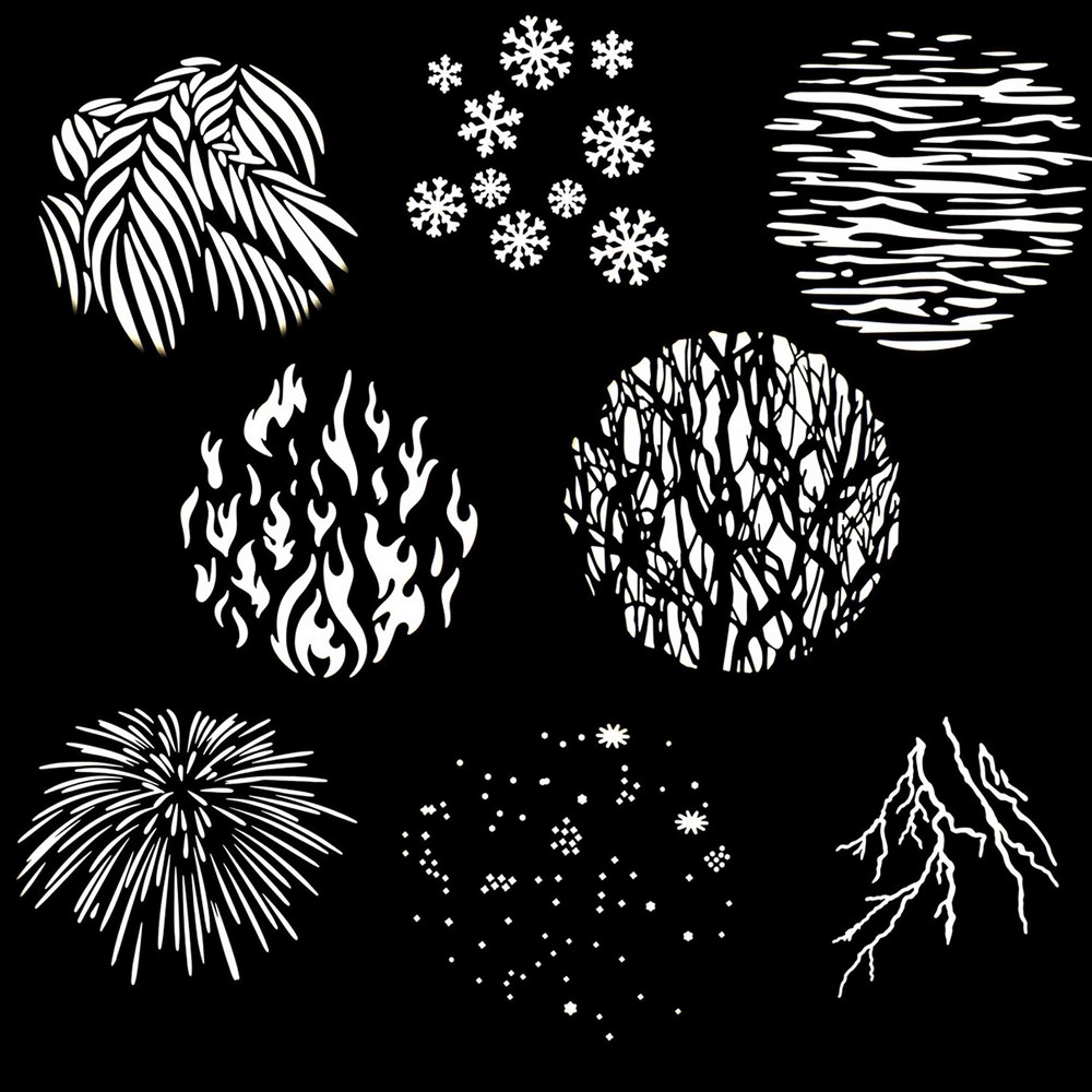 Flames, water ripples, snowflakes, and lightning