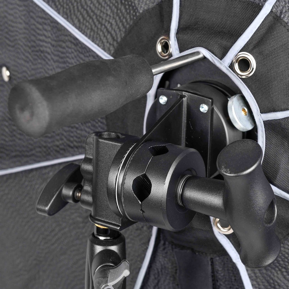 Litemotiv Octa 190 cm är mycket enkel att montera, ta isär och transportera. Hela sofboxen, förutom difusorduk, sitter ihop som en enhet vilket gör hanteringen mycket enkel trots softboxens stora format. Väska ingår vid köp.